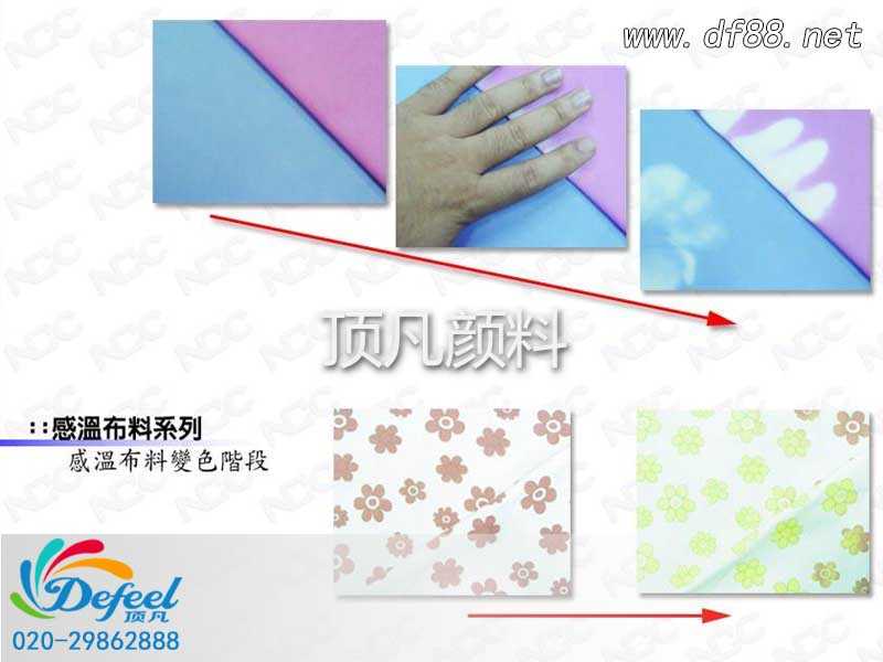 温变粉的变色过程是一个物理加热和化学反应的过程,按变色程序可分为可逆和不可逆。可逆变色粉是指当材料的温度达到或超过变色温度时,颜色发生变化,当温度降到变色温度以下时,颜色恢复到原来的颜色。服装行业采用的大部分是可逆的变温粉,这种变色物质不仅颜色鲜艳,而且可以实现从“有色===无色” 状态的颜色变化。感温变色粉的颜色丰富多彩,可以分为两大类:有色变无色和有色变有色。低温状态下温变粉是深色的,高温状态变浅色。具体的颜色有:大红、玫红、金红、橙红、粉红、宝蓝、蓝色、深蓝、天空蓝、海蓝、孔雀绿、墨绿、草绿、黄色、棕色、黑色等等。
